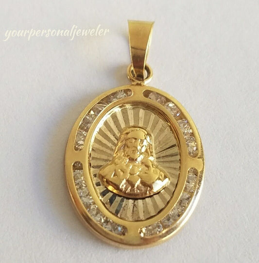 10k yellow gold Jesus Christ diamond cut oval pendant charm 1" long