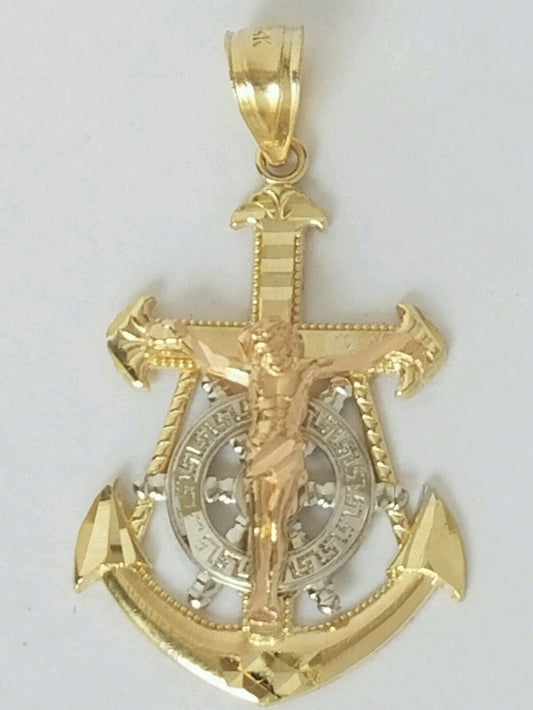 3 tone 14k Yellow Gold Jesus Crucifix Anchor Pendant 1.25 inch long greek key
