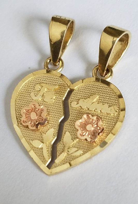 14k solid Yellow Gold 2 piece Te Amo love Split Heart Pendant Charm .85" lng