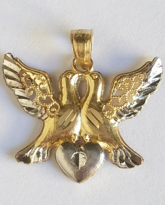 10k Yellow Gold kissing love birds doves heart pendant Charm 0.75 inch long