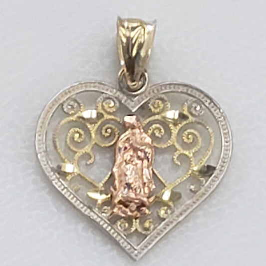 Gold 14k virgin Mary Guadalup heart pendant charm 1.15 inch long Tri Color