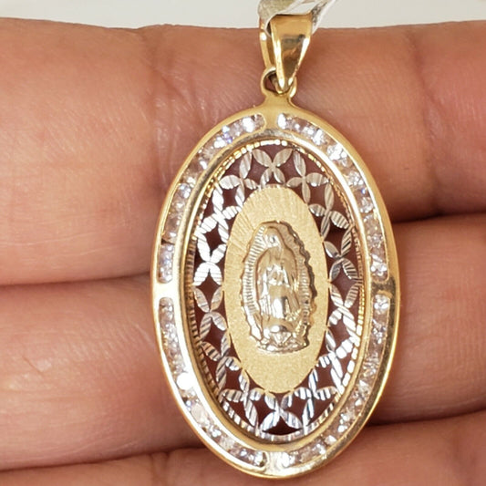Real 14k gold virgin Mary guadalupe pendant charm 1.10 inch oval diamond cut