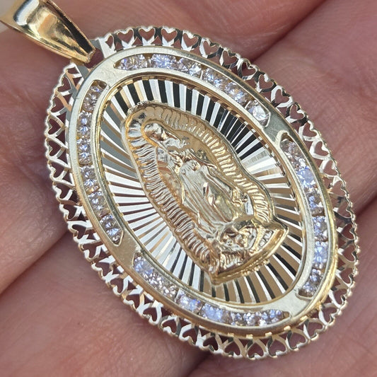 real 14k gold virgin Mary round guadalupe pendant diamond cut 1.30 inch long