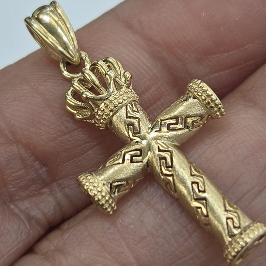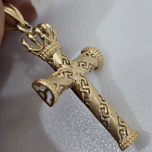Solid 10k Gold Crown Cross Pendant 1.25 Inch Long Greek Key