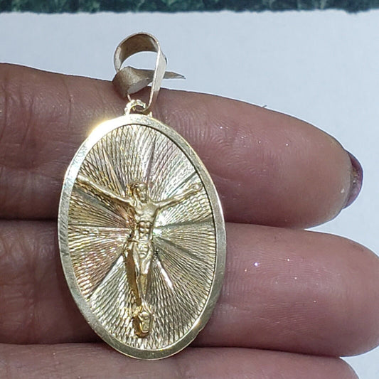 14k gold Jesus crucifix pendant charm 1.50 inch long diamond cut oval